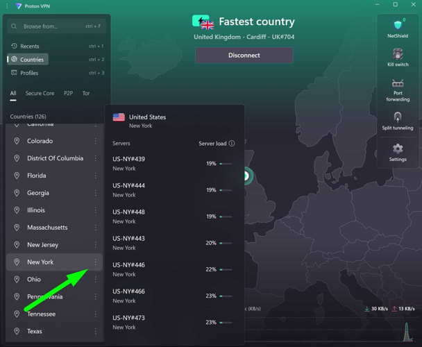 Navigate to the server selection menu and pick a VPN server located in the country whose Netflix catalog you want to unblock, like the United States or United Kingdom.